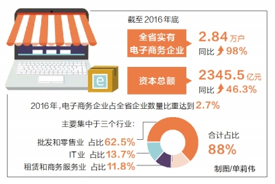 2016年,電子商務企業占全省企業數量比重達到2.7%,較上年同期提升1個百分點。全省電子商務企業主要集中于批發和零售業、IT業、租賃和商務服務業三個行業,占比分別為62.5%、13.7%和11.8%,合計占比88%。