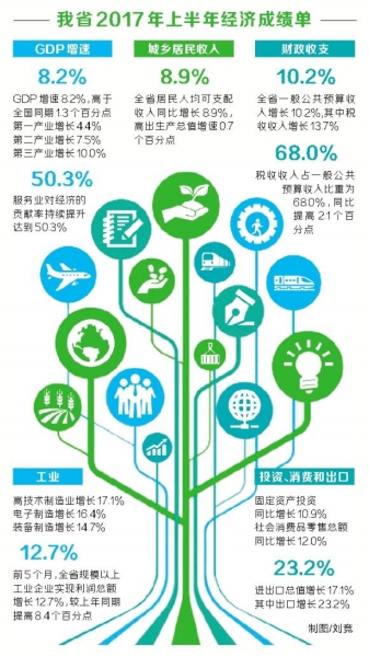城鄉(xiāng)居民收入持續(xù)增加。在居民就業(yè)形勢(shì)穩(wěn)定、社會(huì)保障覆蓋面擴(kuò)大以及居民投資理財(cái)收入增加等因素帶動(dòng)下,今年上半年全省居民人均可支配收入同比增長(zhǎng)8.9%,高出生產(chǎn)總值增速0.7個(gè)百分點(diǎn),居民收入實(shí)際增速跑贏GDP,老百姓有滿滿的“獲得感”。