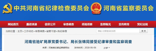 央廣網(wǎng)河南分網(wǎng)消息 (侯琳琳)記者從河南省紀委監(jiān)察委網(wǎng)站獲悉:河南省地質(zhì)礦產(chǎn)勘查開發(fā)局原黨委書記、局長張錦同涉嫌嚴重違紀違法,目前正接受河南省紀委監(jiān)委紀律審查和監(jiān)察調(diào)查。
