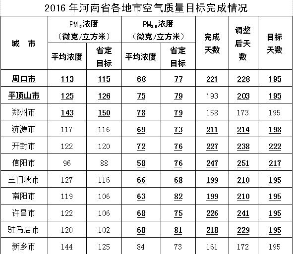 2016年的工作是在2015年因空氣質(zhì)量嚴(yán)重惡化被省環(huán)保廳約談、被環(huán)保部華北督查中心督政的極端困難情況下展開的,全市上下同心同德,背水一戰(zhàn),取得了突出成績。2016年全市空氣質(zhì)量省定責(zé)任目標(biāo):PM10126微克/立方米,PM2.579微克/立方米,優(yōu)良天數(shù)190天(年初)和195天(攻堅后)。實際完成:PM10125微克/立方米,比2015年下降(18微克/立方米)12.6%; PM2.575微克/立方米,比2015年下降(13微克/立方米)14.8%;優(yōu)良天數(shù)193天,比去年同期增加60天,優(yōu)良率52.7%。根據(jù)環(huán)保部關(guān)于沙塵暴天氣特殊處理的最新規(guī)定,平頂山市優(yōu)良天數(shù)將突破200天,超額完成目標(biāo)任務(wù)。按照省大氣目標(biāo)考核辦法,平頂山市大氣綜合考核位全省第3名,被省政府考核認(rèn)定為3個優(yōu)秀單位之一。全省全面完成三項目標(biāo)的只有周口和平頂山,完成PM10、PM2.5兩項目標(biāo)的有周口、鄭州、平頂山3家(見附表)。