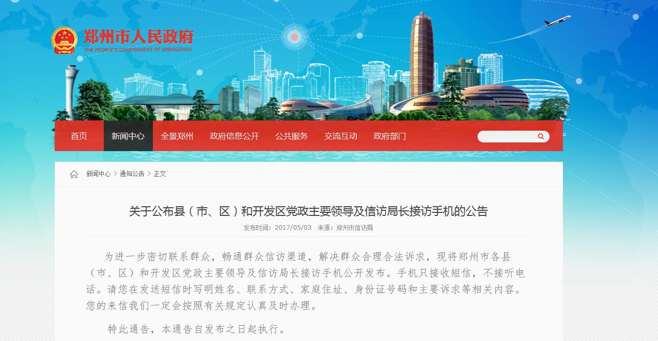 央廣網河南分網消息 日前,鄭州市政府網站發布《關于公布縣(市、區)和開發區黨政主要領導及信訪局長接訪手機的公告》,公布40余位縣(市、區)黨政“一把手”手機號碼,暢通群眾信訪渠道,該公告自5月份起執行,目前僅接受短信舉報。
