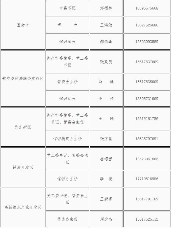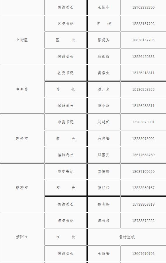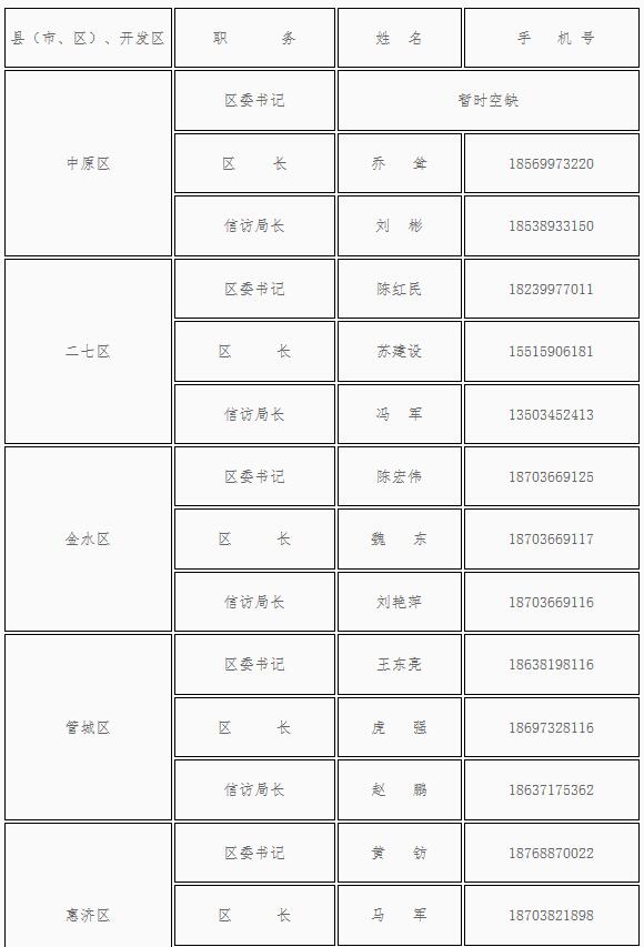 《公告》稱,為進一步密切聯系群眾,暢通群眾信訪渠道,解決群眾合理合法訴求,現將鄭州市各縣(市、區)和開發區黨政主要領導及信訪局長接訪手機公開發布。手機只接收短信,不接聽電話。請您在發送短信時寫明姓名、聯系方式、家庭住址、身份證號碼和主要訴求等相關內容。您的來信我們一定會按照有關規定認真及時辦理。(楊曉娜)