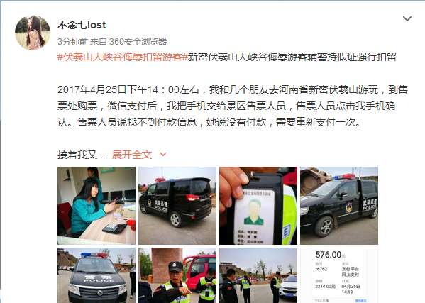 央廣網鄭州5月8日消息(記者胡曉輝)近日,網友李先生通過微博向記者投訴稱,2017年4月25日,他和幾個朋友去河南省新密伏羲山游玩,因出現微信支付重復購票要求退款,與景區售票人員理論引起糾紛,隨后,幾名自稱新密公安局輔警人員要求李先生離開景區未果,李先生遭二次扣留近半小時。