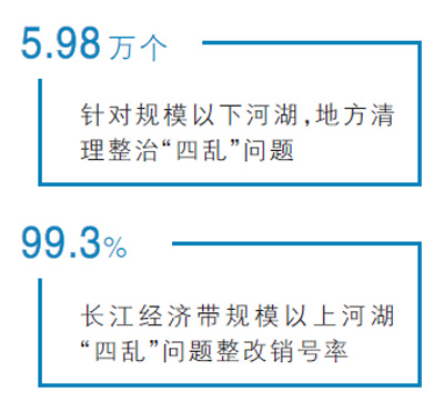 “清四亂”專項行動以來,全國共拆除違法建筑面積3936萬平方米,清理非法占用河湖岸線2.5萬公里,清除河道內垃圾3500多萬噸,整治非法采砂點1萬多個、非法砂石2100多萬立方米,清除圍網養殖近13萬畝。2019年,各地問責河長湖長和有關部門負責人3961人次。通過清理整治,河湖面貌明顯改善,行蓄洪能力提高,河湖水質逐步向好。