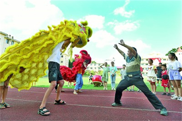 江西宜春市宜豐縣花橋鄉(xiāng)中心小學的學生在老師的帶領(lǐng)下學習舞獅的動作要領(lǐng)。周亮攝/光明圖片