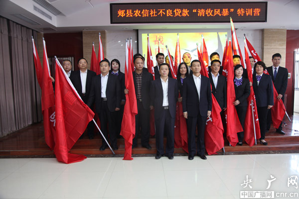 特訓營的開班,標志著郟縣農信社“清收風暴”活動的號角已經吹響,全體員工將思想統一到不良貸款清收工作上來,主動站在維護改革發展成果的高度,樹立敢打必勝的信念,頂住壓力,克服困難,排除干擾,打出氣勢、打出聲威、打出農信社人的精氣神,確保“清收風暴”活動全面勝利!
