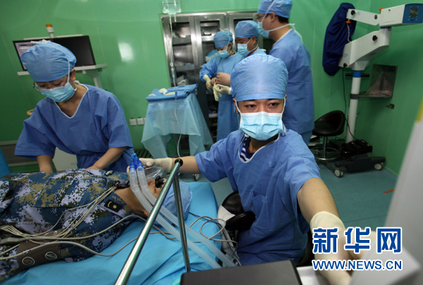 4月23日,和平方舟醫院船人員對“傷員”進行手術。 新華社發 黃育平 攝
