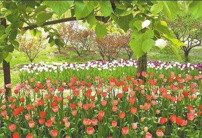 洛陽的郁金香花園是典型的“雙花斗艷”之地,四月里牡丹的國色天香令人流連忘返,四月底五月初盛開的郁金香花更顯優雅清新,牡丹與郁金香交織在一起,演繹著繁華奔放與清新優雅兩種不同的風格。郁金香花園里的建筑多為荷蘭風格,起伏的小型草原,精致的白色雕像群,高大的荷蘭風車,仿佛置身于荷蘭的某個風情小鎮;遠處熱鬧的游樂場,郁郁蔥蔥的綠樹,潺潺的流水,體現出中國風格的園林之美。安靜與繁華在這里并存,十分愜意。據介紹,洛陽郁金香花園的花卉種植面積近150畝,是人們賞花游玩、情侶傳達愛情信息、感悟異國風情的一個好去處。