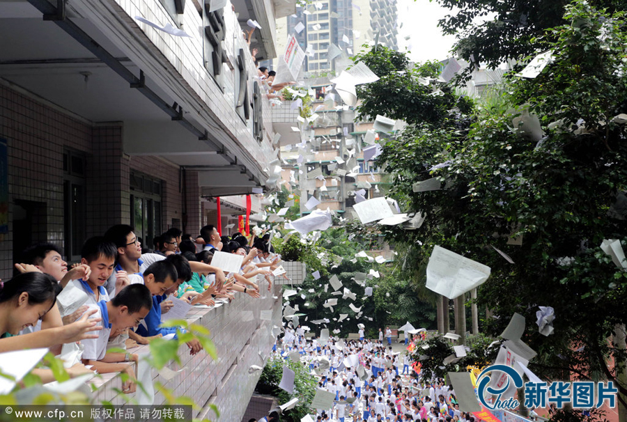 2014年06月04日上午,廣州市,廣州大學附屬中學高三、初三學生將廢棄試卷扔出教室,釋放壓力,迎接即將到來的考試。