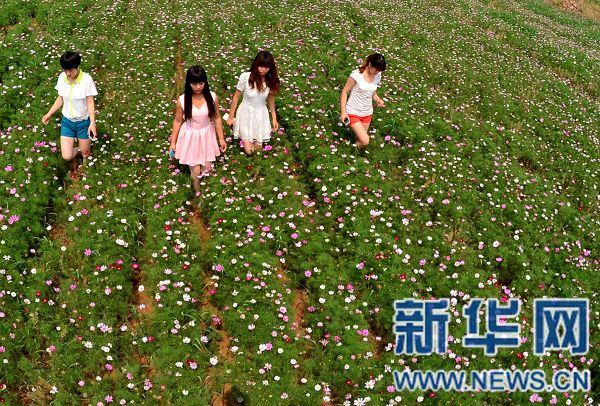 央廣網河南分網消息 據新華網河南頻道報道:當日,在位于伏牛山區的河南省汝陽縣大虎嶺戶外運動基地,千余畝色彩斑斕的波斯菊競相綻放,吸引眾多游客前來賞花留影。(新華社 記者王頌 攝)