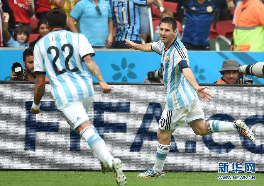 6月25日,阿根廷隊球員梅西慶祝任意球得分。當(dāng)日,在巴西阿萊格里港河濱球場進(jìn)行的2014年巴西世界杯小組賽F組比賽中,尼日利亞隊對陣阿根廷隊。(新華社記者李尕攝)