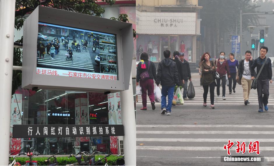 10月9日,河北石家莊行人闖紅燈抓拍“神器”,嚴(yán)密地“監(jiān)督”著通過斑馬線的市民們。該“神器”為行人闖紅燈自動(dòng)識(shí)別抓拍系統(tǒng),如果行人信號(hào)燈為紅燈時(shí),仍有市民通過斑馬線,系統(tǒng)會(huì)自動(dòng)將其人圖像拍攝并形成照片到電子屏幕上。據(jù)了解,這在華北地區(qū)尚屬首家。圖為行人闖紅燈抓拍“神器”,行人違章將被曝光。中新社發(fā) 翟羽佳 攝