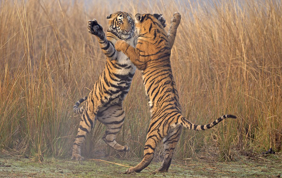 野生動物攝影師安迪·洛茲自從兩只小老虎去年出生以來,就一直在密切關注著它們的成長。他用鏡頭記錄下了這一畫面。雖然從舞蹈的嚴格意義上來評斷,這兩只小老虎的“舞”技一般,但它們在“舞蹈”中所散發出的熱情值得稱贊。而且,看上去它們的律動感不錯,配合地也相當有默契。(國際在線專稿 米粒)