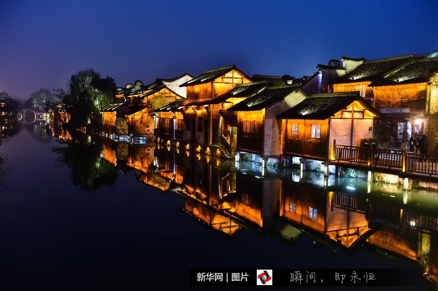 12月15日,烏鎮西柵呈現美麗的夜色,靜待大會開幕。
