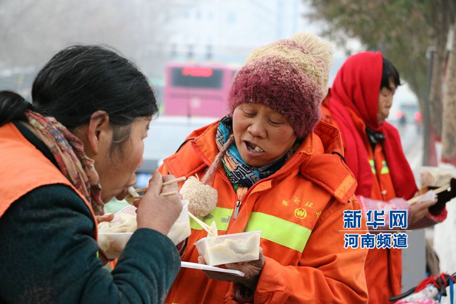 12月22日,在河南省鄭州市,“餃子哥”王孝利和志愿者們將一碗碗熱騰騰的餃子送到了環(huán)衛(wèi)工人手中。當(dāng)日是農(nóng)歷二十四節(jié)氣中的“冬至”,“餃子哥”和志愿者們準備了600份餃子,免費送給環(huán)衛(wèi)工人、執(zhí)勤交警和外來務(wù)工人員,讓他們在寒冬中感受溫暖。這一做法,“餃子哥”已連續(xù)堅持了4年。 馮磊 攝