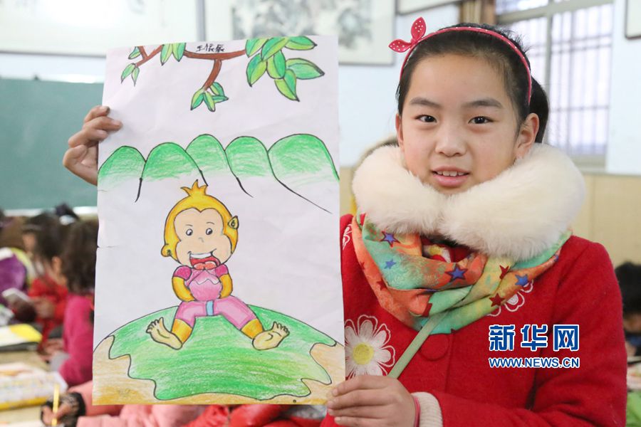 1月19日,河南溫縣北冷鄉中心小學一名學生在展示自己畫的猴子作品。