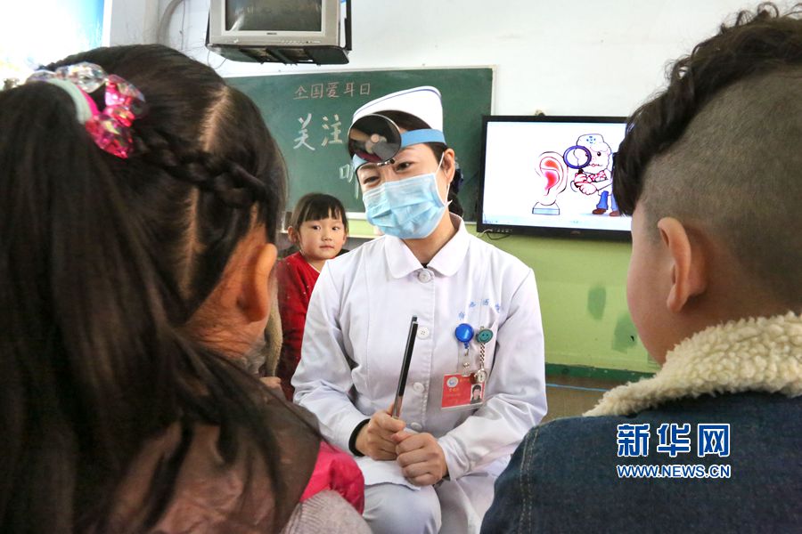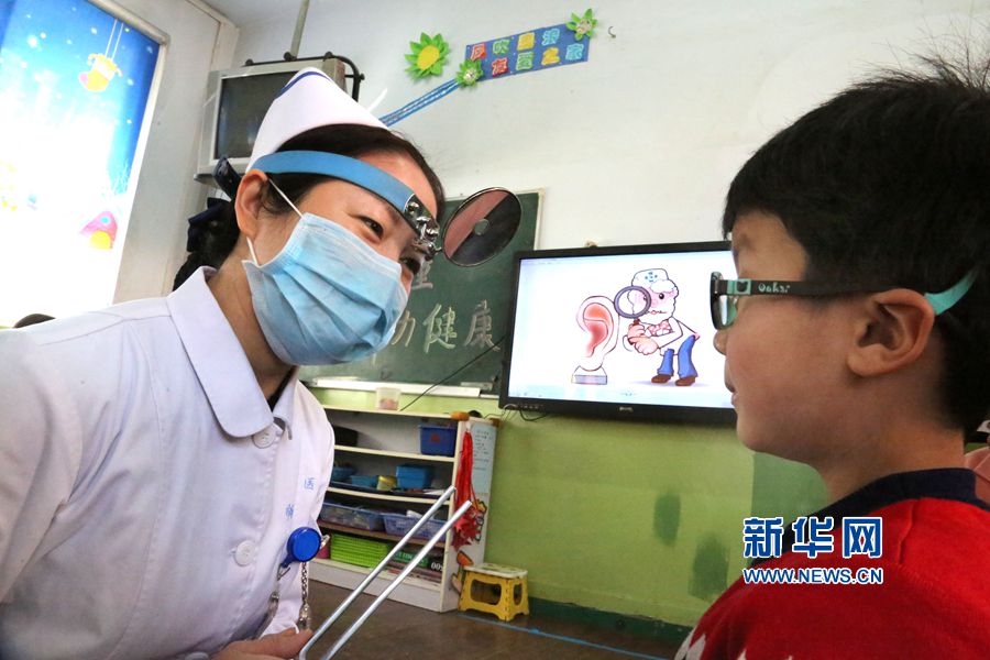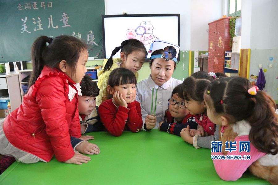 2016年3月2日,河南省安陽市婦女兒童活動中心幼兒園,來自安陽地區(qū)醫(yī)院耳鼻喉科的醫(yī)生曹艷利正在和大三班的任博森小朋友親切交流并用音叉(聽力檢測儀)為其做聽力檢查。
