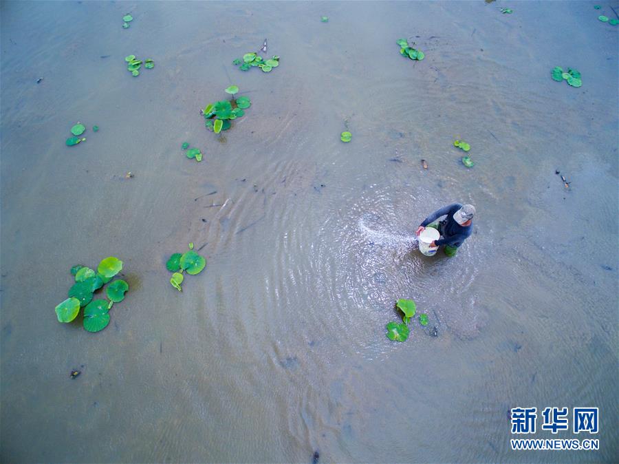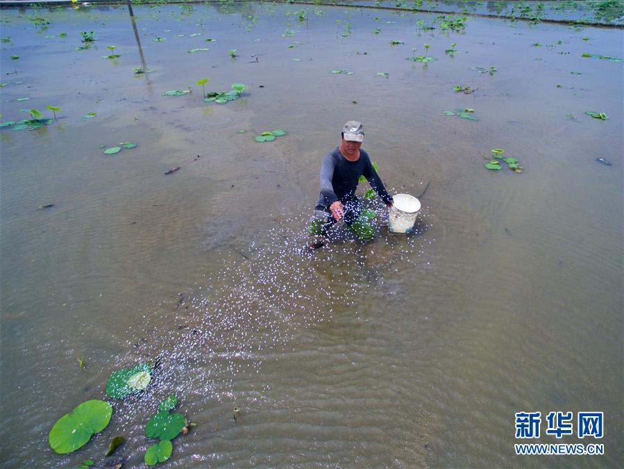 5月5日,福州市閩侯縣南通鎮曹浦村村民為藕田施肥。當日是二十四節氣中的立夏,福建省福州市閩侯縣南通鎮蔬菜基地一派繁忙景象,當地菜農利用晴好天氣搶抓農時,精耕細作,爭取有個好收成。新華社記者 姜克紅 攝