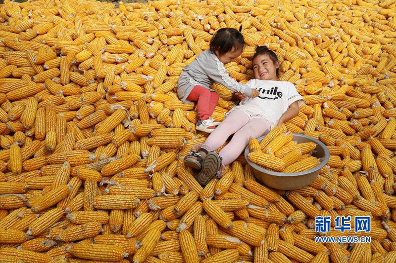 10月5日,河南省溫縣黃莊鎮衛村兩名小朋友在晾曬的玉米堆上玩耍。