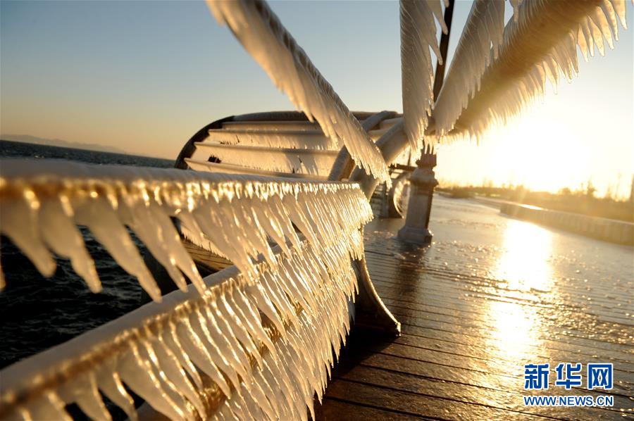 12月27日,大連東港沿海護欄冰凌凝結,在朝霞的映照下十分美麗。新華社發(呂文正 攝)
