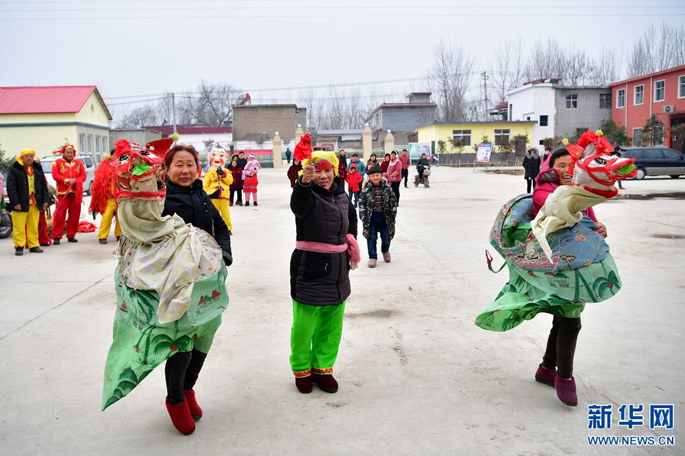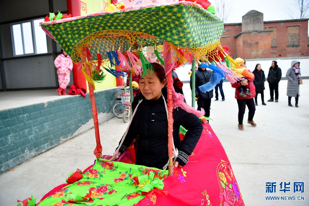 2月7日,村民在羅閣村文化舞臺表演劃旱船。 當日,河南省駐馬店市西平縣盆堯鎮羅閣村的文化舞臺熱鬧非凡,村民表演了舞獅、豬八戒背媳婦、抬轎子、劃旱船、騎竹馬、吹喇叭等民俗節目,吸引眾多村民前來觀看。新華社記者馮大鵬攝 -