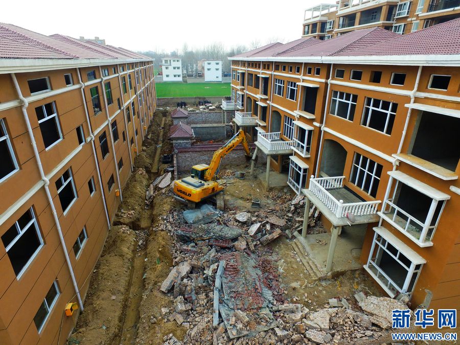 •    這是2月17日航拍的大型機械拆除華夏外國語小學違建別墅院墻的場面。河南太康縣華夏外國語小學開辦以來,多年間陸續無證開發商用住房并對外公開出售。太康縣住建局近日組織130余名工作人員對別墅進行拆除。2月22日記者從太康縣宣傳部獲悉,10棟別墅已拆除4棟。新華社記者馮大鵬攝
