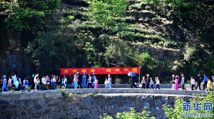 •    4月23日,徒步愛好者在河南省商城縣西河景區內。