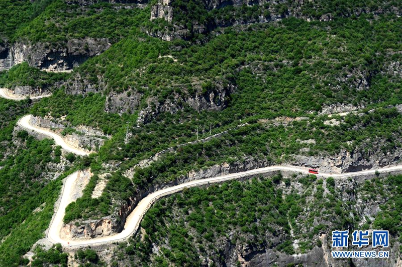 •    5月16日,一輛汽車在山西省平順縣的虹梯關“掛壁公路”行駛。山西省平順縣的虹梯關“掛壁公路”位于太行山峭壁之上,長度約10公里,鑿山穿洞,道路艱險,風光獨特。 新華社發(梁棟 攝)