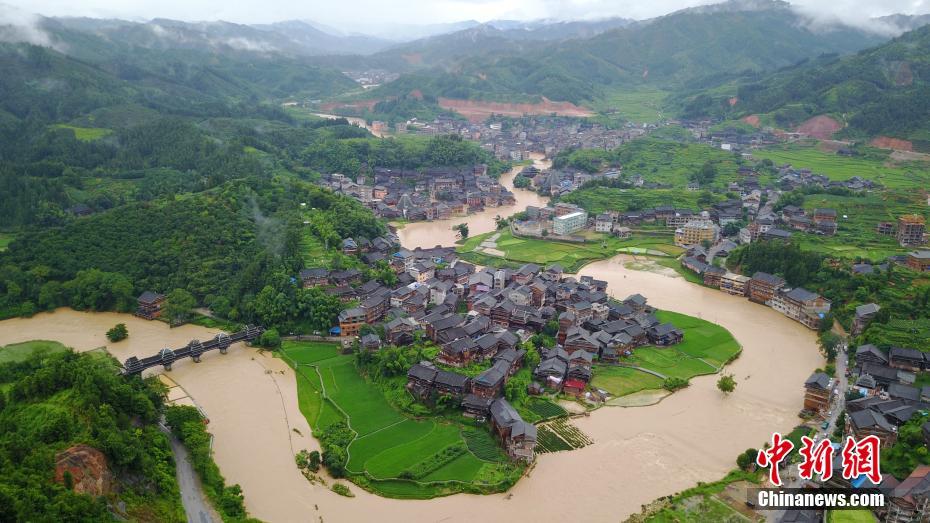 7月10日,廣西柳州市三江侗族自治縣遭受強降雨襲擊,該縣城程陽八寨景區內河流水位上漲,程陽風雨橋被洪水圍困。該景區因災封閉,已緊急疏散滯留在景區內的全部游客。建于1912年的程陽風雨橋是世界歷史名橋,也是中國迄今保存較完整、規模較大的侗寨風雨橋。圖為無人機航拍被洪水圍困的三江侗族自治縣程陽風雨橋。龔普康 攝 -