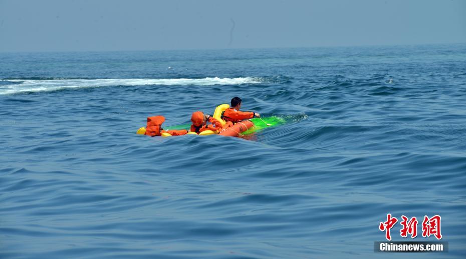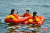 16名中國航天員和2名歐洲航天員,8月21日在山東省煙臺市附近海域圓滿完成了為期17天的海上救生訓練任務。圖為訓練期間,8月17日,中國航天英雄楊利偉(中)參與訓練。 中新社發 朱九通 攝 -
