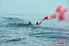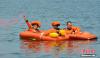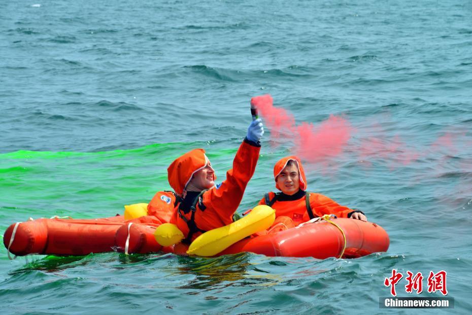 16名中國航天員和2名歐洲航天員,8月21日在山東省煙臺市附近海域圓滿完成了為期17天的海上救生訓練任務。圖為訓練期間,8月8日,參加訓練的航天員在水上使用光煙信號管。 中新社發 朱九通 攝 -