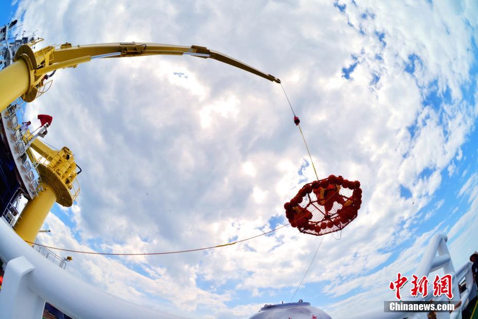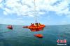 16名中國航天員和2名歐洲航天員,8月21日在山東省煙臺市附近海域圓滿完成了為期17天的海上救生訓練任務。圖為訓練期間,8月2日,甲板上的機械吊臂把救生吊籃起吊入水。 中新社發 朱九通 攝