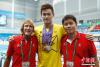 9月7日,天津全運會孫楊摘得男子1500米自由泳及男子4x100米混合泳兩枚金牌,以六金一銀七枚獎牌結(jié)束全運會賽程。圖為孫楊與中方教練鄭坤良(右)及外籍教練丹尼斯(左)合影。 中新社記者 富田 攝 -