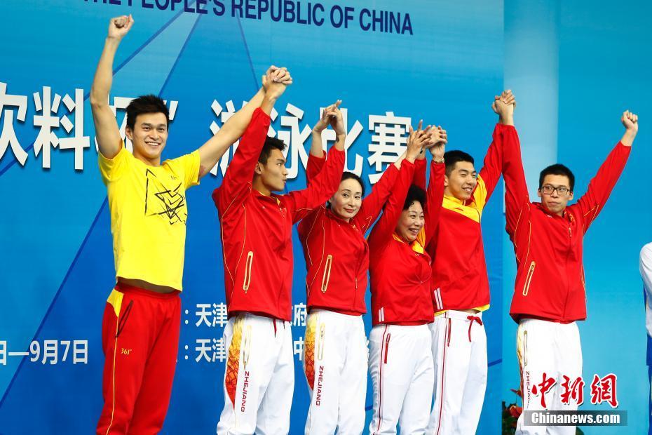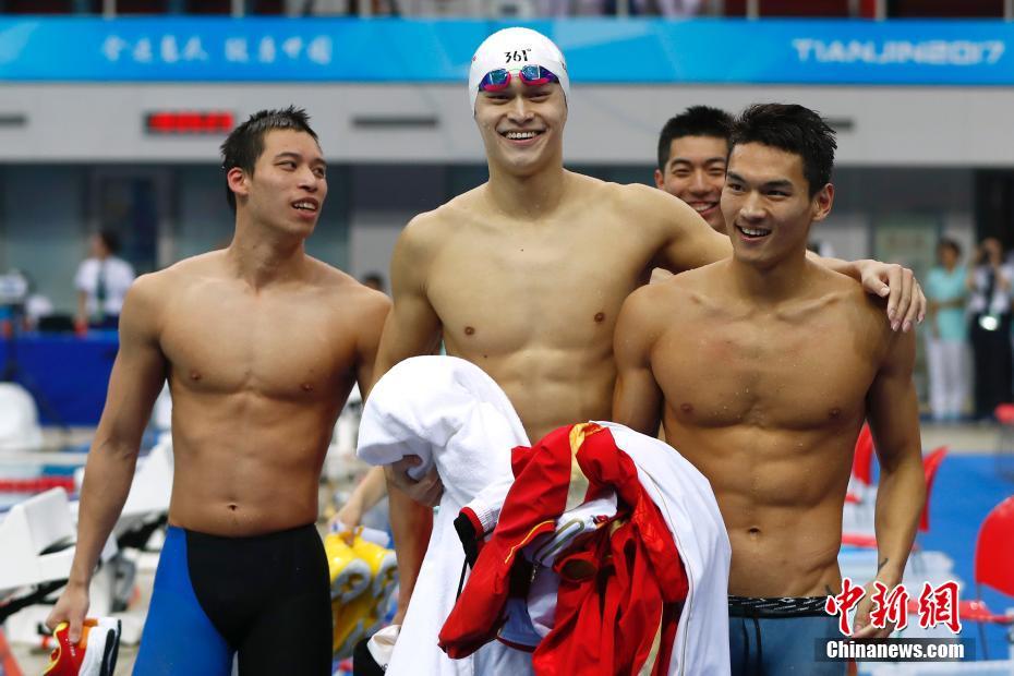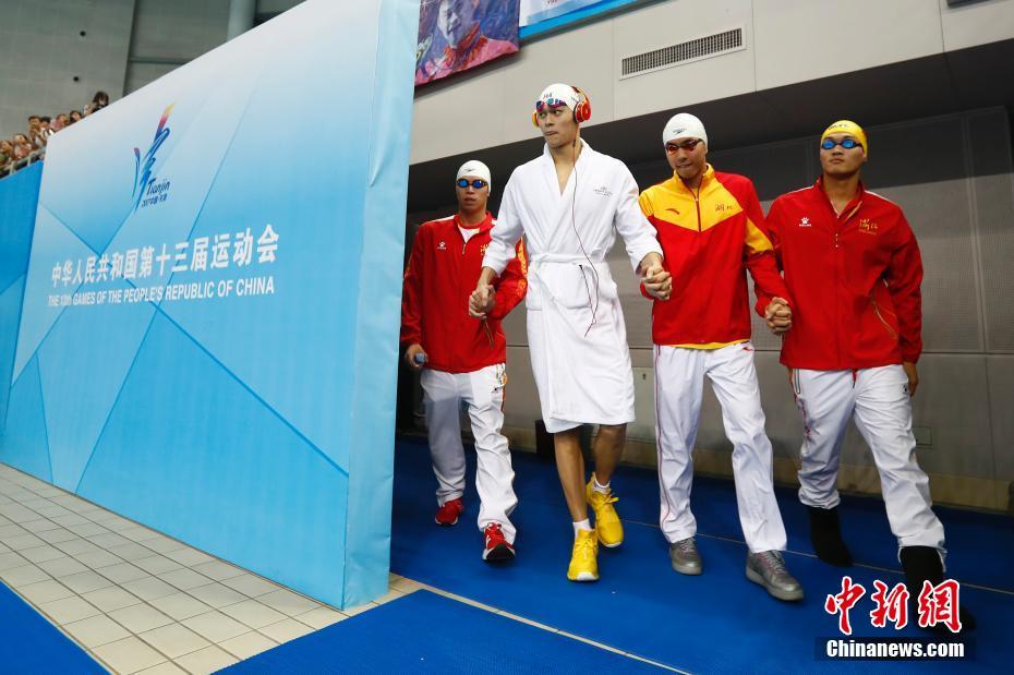9月7日,天津全運會男子4x100米混合泳決賽在天津奧林匹克中心游泳跳水館舉行,由徐嘉余、閆子貝、李朱濠、孫楊組成的浙鄂隊以3分33秒12奪冠。 中新社記者 富田 攝 -