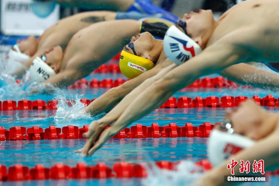 9月7日,天津全運會男子4x100米混合泳決賽在天津奧林匹克中心游泳跳水館舉行,由徐嘉余、閆子貝、李朱濠、孫楊組成的浙鄂隊以3分33秒12奪冠。圖為徐嘉余(黃帽)躍入水中。 中新社記者 富田 攝 -