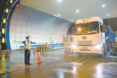 8月1日,一輛貨車通過鄭州圃田高速收費站,享受到優惠。工作人員引導貨車通過收費站。記者王錚攝