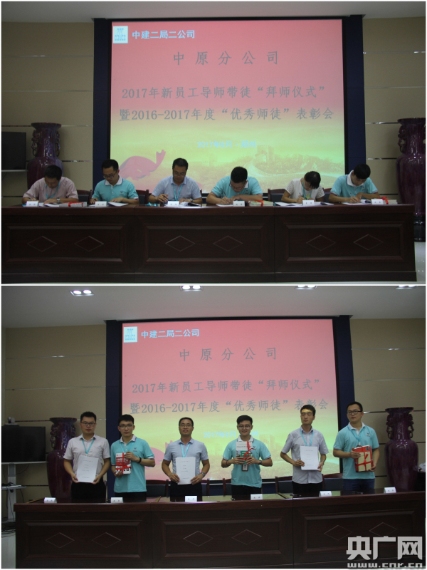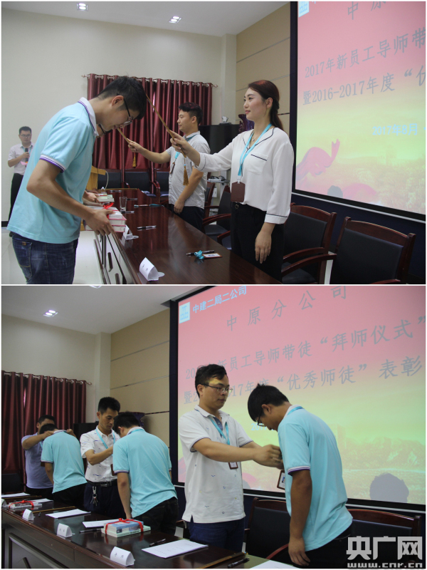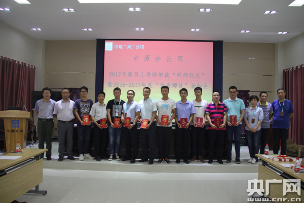 央廣網河南分網8月16日消息 導師帶徒活動作為中建二局二公司中原分公司的品牌活動,尤其受到了領導的高度重視。為了保障活動的有效落地,發揮出“傳、幫、帶”的作用,前期由人力資源部及團委認真策劃、精心籌備,共對13個導師帶徒活動點進行全覆蓋參與。中原分公司總部作為導師帶徒活動的最后一站,8月11日,2017屆新員工導師帶徒拜師儀式暨2016年優秀師徒表彰會在分公司蒼狼學院隆重召開。