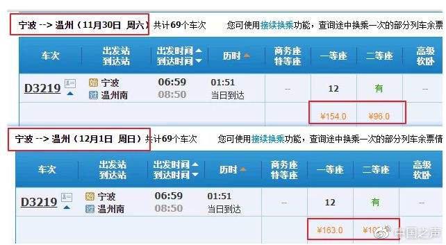 按照5.5折最低折扣,目前蘭州到西安的票價為174.5元,在最低價時,或將只需96元。然而,票價也并不是都處于降價趨勢,對于部分列車段而言,票價也出現了上升的情況。以寧波開往溫州的G2343次列車為例,11月30日,該車的商務座288元,一等座154元,二等座96元;而12月1日,該車的票價商務座、一等座、二等座分別上漲17元、9元和6元,票價出現了小幅上漲。