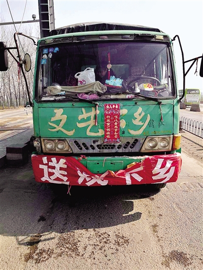 央廣網(wǎng)河南分網(wǎng)消息 2月24日11時40分,在蘭考縣220國道執(zhí)法服務(wù)站,一輛中型貨車從附近道路駛來,車頭條幅上寫著大字:“文藝下鄉(xiāng)”“送戲下鄉(xiāng)”,不過條幅卻把車牌號完全遮擋住;車身兩側(cè)用綠漆木板擋著,上面寫著白色大字“山東省定陶區(qū)陶韻二夾弦劇團(tuán)”,車頂上用帆布蓋著。