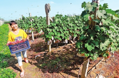 圖為在郟縣長橋鎮確李村“神農夫葡萄莊園”,返鄉創業青年李艷娟正在果園里采摘葡萄,豐收的喜悅使她笑逐顏開。