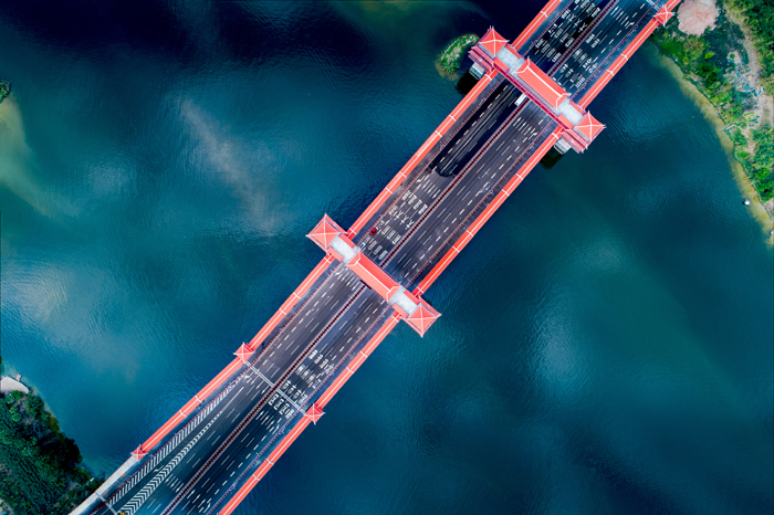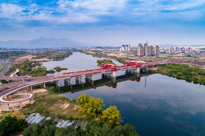 凌空俯瞰金峰大橋,紅色的廊亭、樓閣十分醒目的橫跨在九龍江西溪上。金峰大橋設計為景觀性大橋,主橋橋型采用“廊橋薌韻”方案,橋梁兩側人行道設置有長廊和古亭,橫向設置兩座人行天橋,紅磚瓦、燕尾屋融入了閩南特色建筑元素。金峰大橋是漳州九龍江上第一座具有“閩南薌韻”廊橋和古亭標志性的大橋,成為漳州一張最靚麗的名片。
