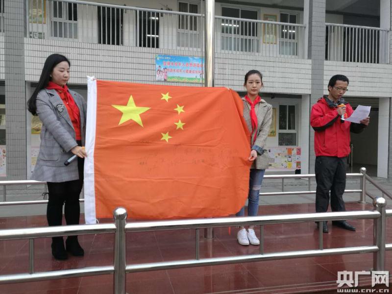 第32次南極科考隊隊員、十堰氣象臺高級工程師文強,將南極科考站懸掛過的一面國旗,贈送給十堰市實驗小學,并向師生們講述了這面國旗的巨大含義。據了解,這面國旗上有第32次南極科考站全部隊員的簽名,這面國旗將收藏在十堰市實驗小學校史館里。