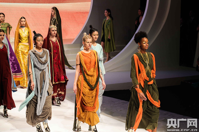 隨后,知名設(shè)計師鄭清兒帶來新作品發(fā)布,其主題為“絲路榮耀·緣起敦煌”,貫穿傳統(tǒng)藝術(shù)精髓的服裝在模特們的精彩詮釋下,體現(xiàn)了設(shè)計師充滿禪學(xué)深意的設(shè)計理念。