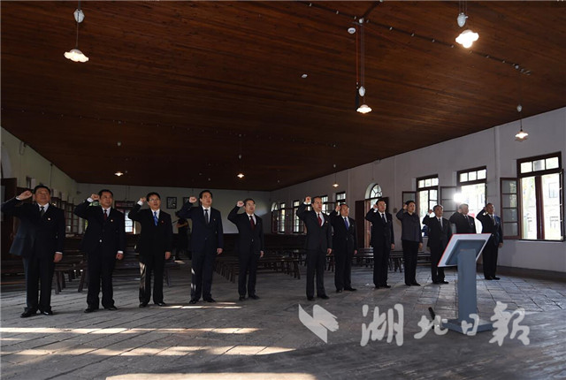 湖北日報客戶端訊(全媒體記者張曉峰、周呈思、攝影記者 陳跡)在全省上下深入學習宣傳貫徹落實黨的十九大精神之際,8日下午,省委書記蔣超良帶領省委常委,專程瞻仰武昌農民講習所舊址,重溫入黨誓詞,表示要辦好新時代湖北“講習所”,深入學習宣傳貫徹習近平新時代中國特色社會主義思想,在學懂弄通做實上下真功夫,用習近平新時代中國特色社會主義思想武裝頭腦、指導實踐、推動工作;不忘初心、牢記使命,為決勝全面建成小康社會和建設社會主義現代化強省而不懈奮斗。