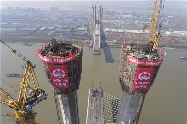 記者看到,安九鐵路鳊魚洲長江大橋位于長江下游河段,與福銀高速公路九江長江二橋相望。爬上橋面,只見兩座H型結(jié)構(gòu)的主塔高聳,其中北主塔高252米,約80余層樓高;南主塔高242米,已于去年12月30日封頂。