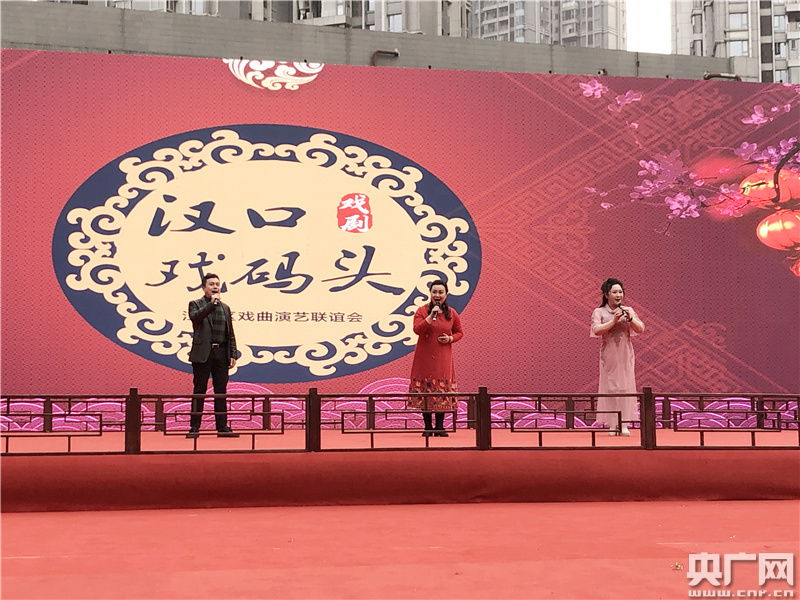 過大年、唱大戲,是春節的傳統文化活動不可缺少的一部分。當天下午,“梨園春韻”作為首場演出,用戲曲為“戲窩子”江漢添彩。傳統京劇《貴妃醉酒》、現代京劇《紅色娘子軍》、漢劇小戲《春回戲碼頭》、楚劇《打金枝》選段、黃梅戲《天仙配》等經典戲曲選段精彩上演,博得現場觀眾的陣陣掌聲。