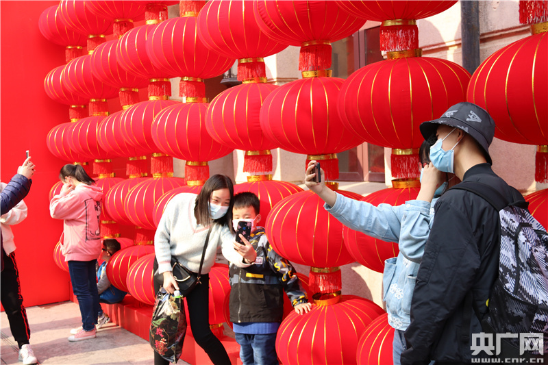 圖為:游客紛紛在火紅的背景墻前拍照“打卡” 央廣網發 李磊攝