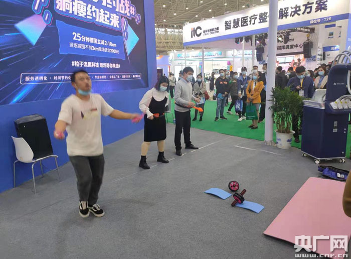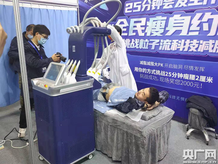 “加油跳,跳滿25分鐘,只要沒有像他們說的減脂成功,我們就能得到獎勵”在該展館的醫普茂展區,一名參與“全民瘦身約戰”的女孩對同伴喊道。活動現場,不少參觀者踴躍參加25分鐘減圍挑戰,但在經過約十分鐘的跳繩與搖健身環后均“敗下陣來”。隨后,該參展商向大家介紹了核心“黑科技”——粒子流轟脂科技,并邀請參展人群進行體驗。