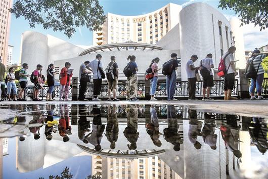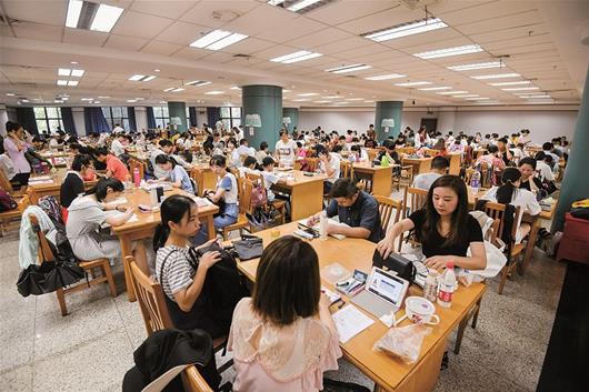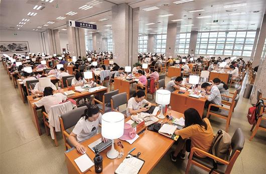 天氣炎熱,湖北省圖書館、武漢市圖書館內閱讀納涼的讀者爆棚,兩家圖書館日均涌入1萬多人。左圖為昨日清晨,讀者早早地在武漢市圖書館外排隊等待開門。 楚天都市報記者徐穎蕭顥攝影報道