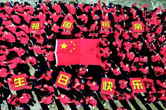 9月23日,保康縣城關鎮小學學生高舉祝福標牌,和國旗合影。當日,該校開展主題教育活動,學生們通過舉行升旗儀式、合唱愛國歌曲、和國旗合影等形式,弘揚愛國精神,喜迎新中國成立 70周年。